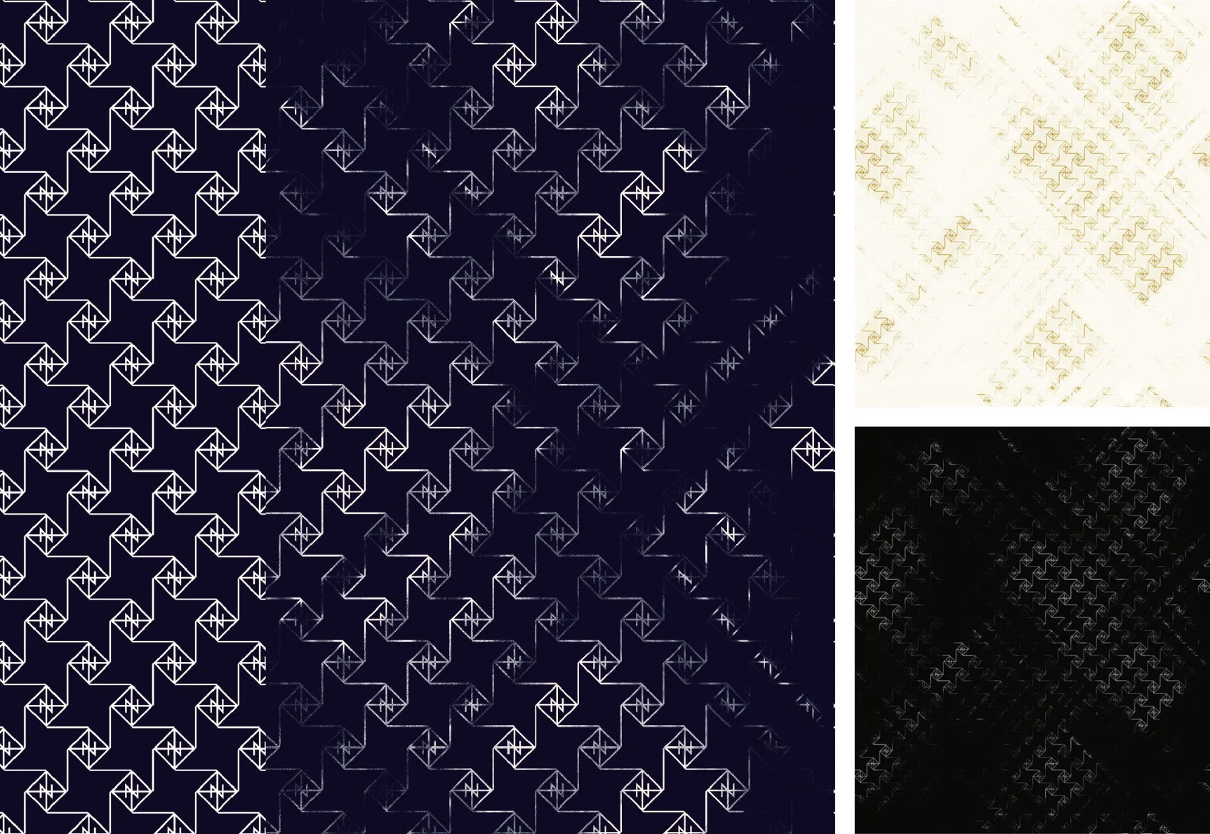 A continuous pattern newly designed by extracting the petal elements from YASUKA.M's artwork. Inspired by the image of petals dancing in the sky, the design evokes the flow of sand and wind. To create depth, delicate details are layered intricately, transitioning from untouched white spaces to finely rendered textures.